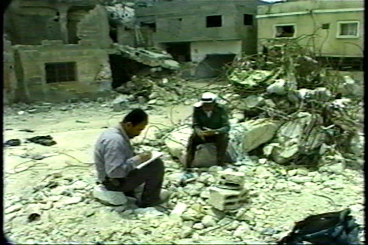 取材は難民キャンプ住民からの聞き取りが中心だ。「ヘリコプターが建物を破壊し、戦車が『武装青年』を攻撃し、その後ろからブルドーザーがやってきた」「(車椅子の身障者が)家に残っていると訴えたがブルドーザーで押し潰された・・・私たちが見つけたのは肉片だけだった。」「投降した友人は撃たれ、その上をブルドーザーが通った。」