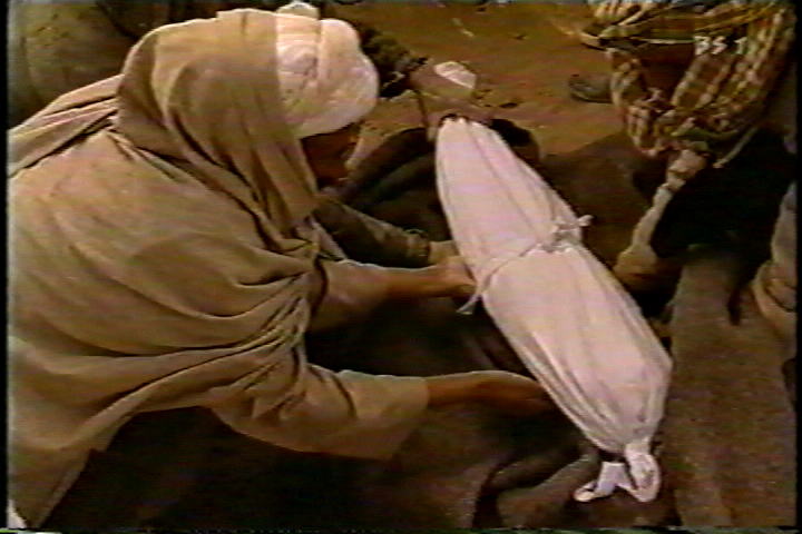 男と男の子だけ、女の子の母親は、埋葬に立ち会わないでテントの中にいる